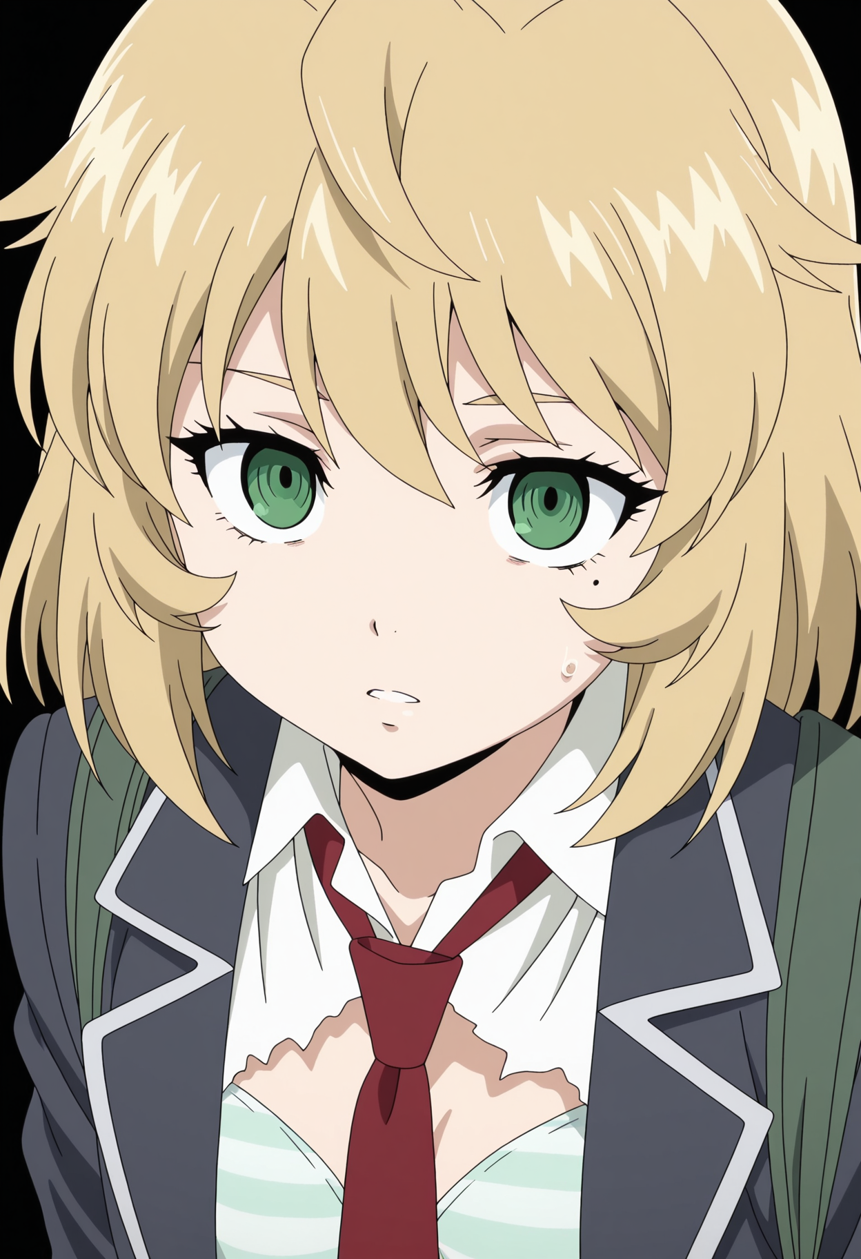 1girl, solo, mayuko nise, blonde hair, green eyes, ponytail, mole, mole under eye, short hair, bangs