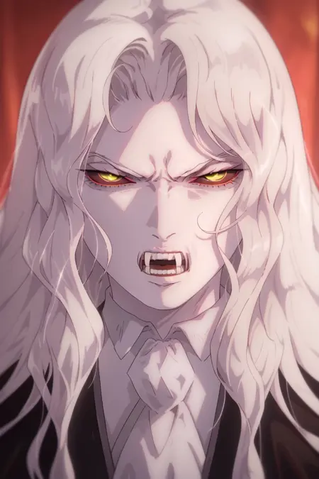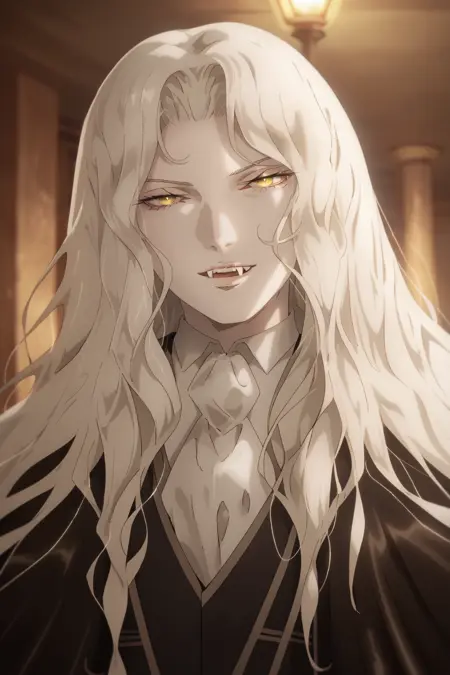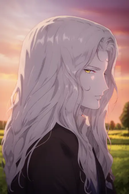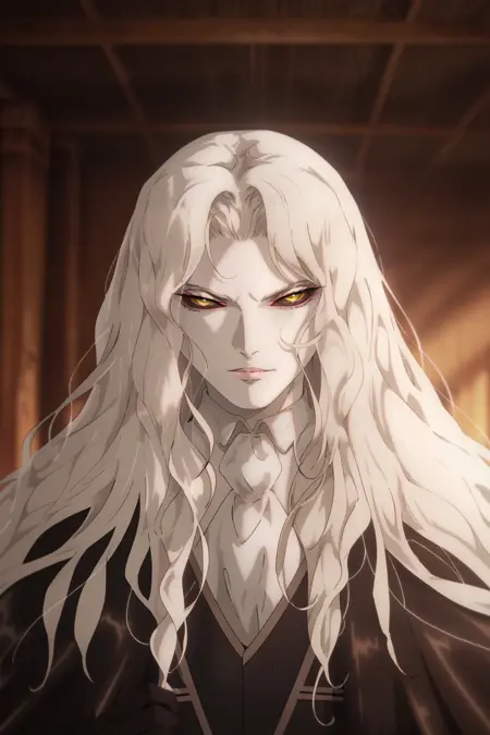 black cape, black coat, white shirt, white ascot, black gloves, black pants, black shoes,