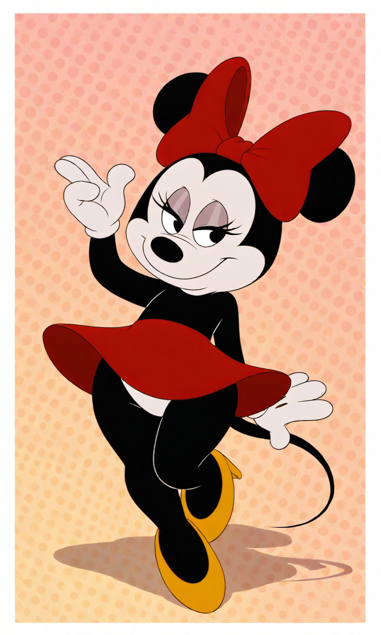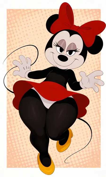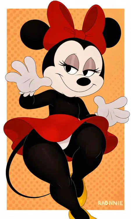 标签:RBminnie, 黑色身体, 黑色眼睛, 圆耳朵, 红色蝴蝶结, 红色裙子, 白色手套, 黄色高跟鞋, 老鼠尾巴, 四根手指, 黑色躯干