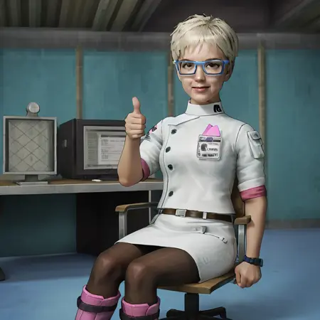 1人の少女、単独、金髪、短髪、茶色の目、青フレームの眼鏡、実験服、名札、ベルト、腕時計、スカート、パンティーハイズ、ピンクのブーツ