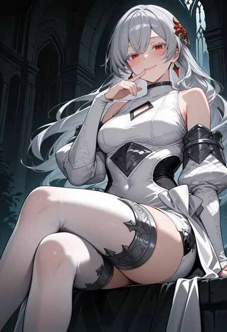 흰색 드레스, 소매 없는 드레스, 옷 절단 디자인, 하울터넥, 분리형 소매, 짧은 드레스, 흰색 허벅지 양말, 갑옷 같은 드레스,
