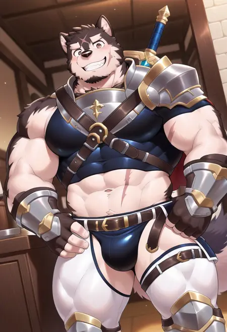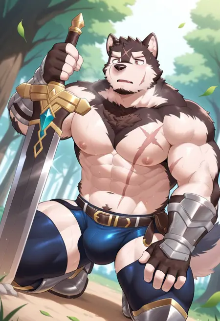 • Reinforcement Prompts: "furry, dog boy, tail, brown eyes, scar, scar on face, muscular, masculine, bara, large pectorals"