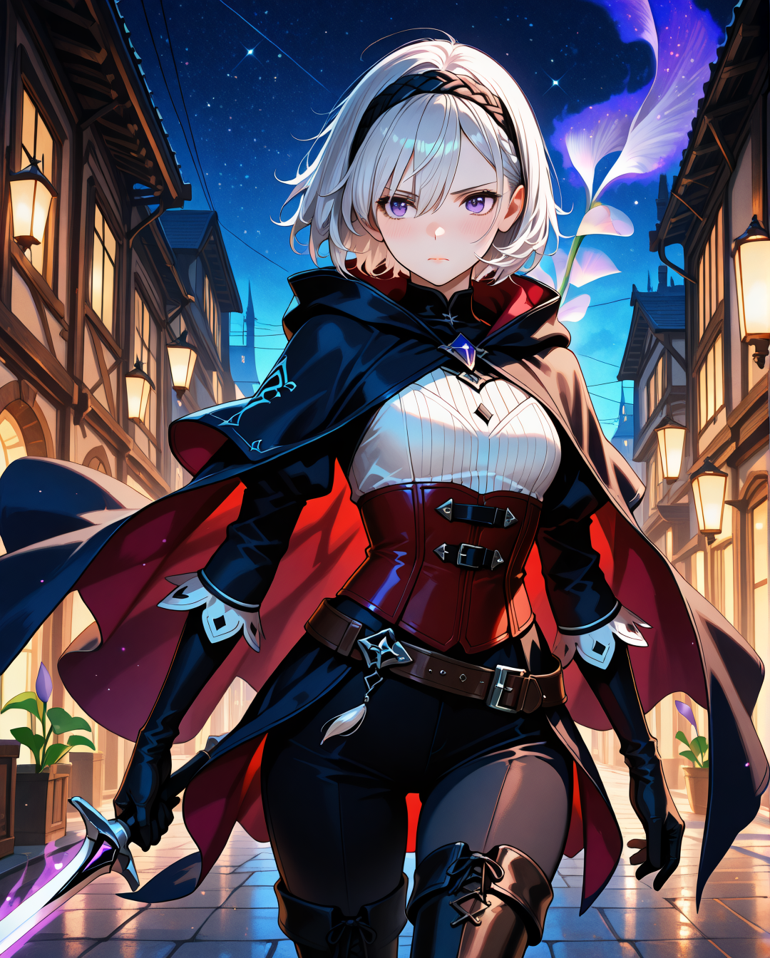 カラは、『Last Reader Standing』に登場するオリジナルキャラクターであり、本が神話的な力を目覚めさせるダークファンタジー世界に生きる。キリンのスラムで育ったカラは、元は泥棒だったが、やがて『ナイトクィーンの書』と結びついた影の刺客となる。彼女は優雅さと危険性の完璧な融合を体現している:短い銀髪、鋭い紫の瞳、筋肉質でしなやかな体躯、白いコルセット、赤い縁のついたマント、そして二本の魔術的に強化された短剣を身に着けたゴシックブラックの刺客の衣装を纏っている。このLoRAは、彼女の静かなる性質、猫のような姿勢、そして悲劇的な美しさを強調しながら、視覚的アイデンティティを忠実に再現している。月光の下で静かに立つときも、影から飛び出すときも、カラは常に冷たい集中力と神秘的な優雅さを放つ。