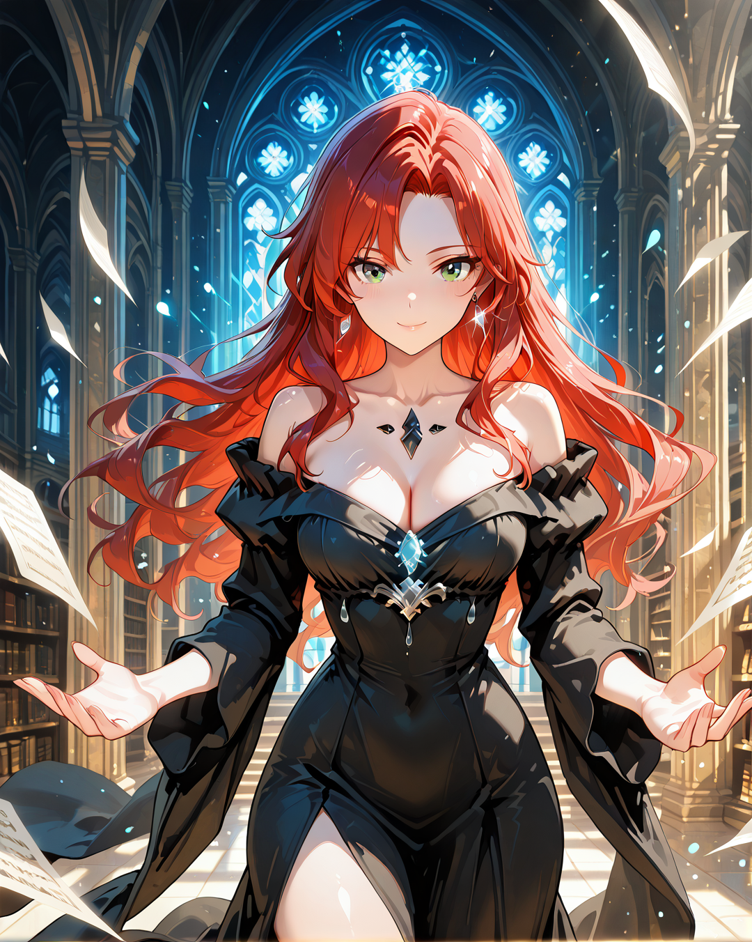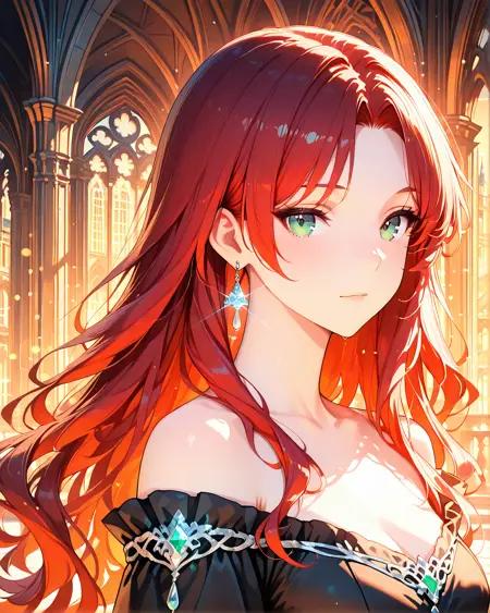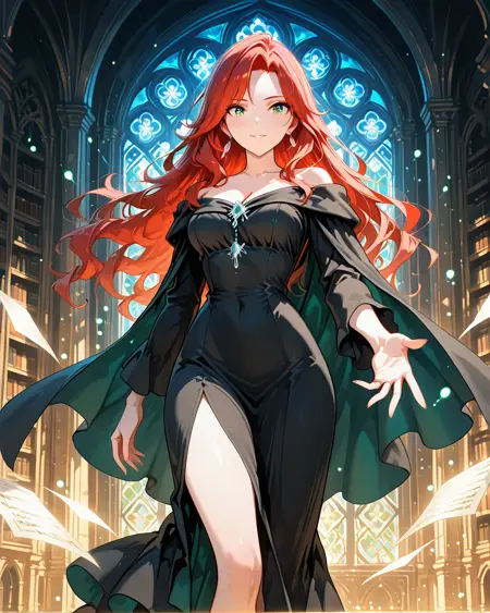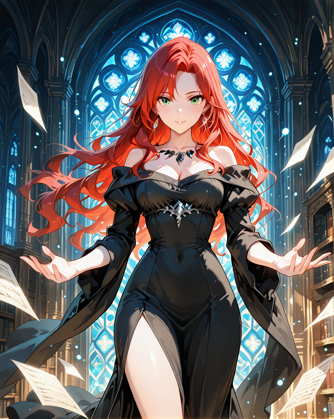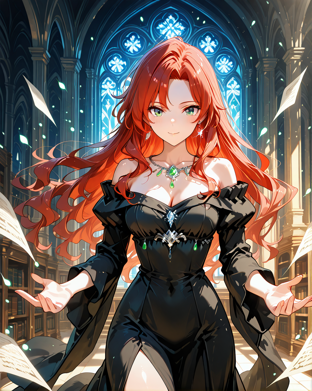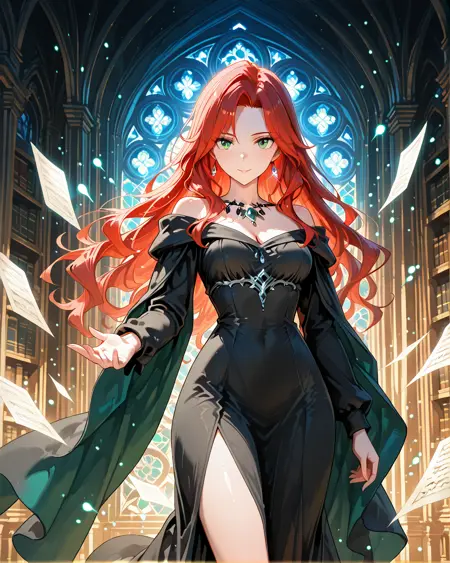 Miranda from Last Reader Standing, elegant and feminine, medium chest, intense green eyes, long deep crimson hair, wearing an off-shoulder black gown, form-fitting long black dress, subtle draping, smooth fabric folds,