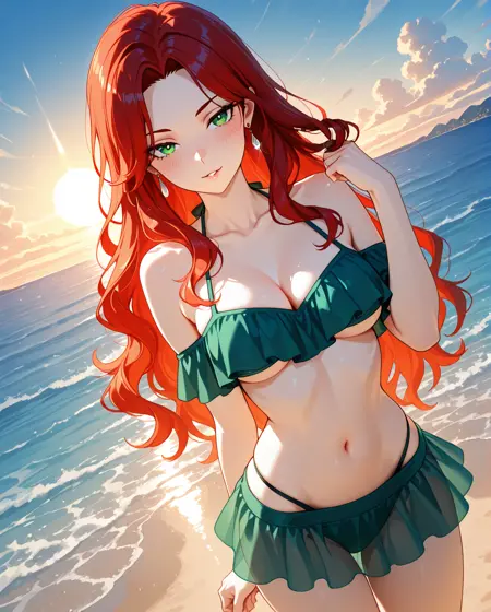 long hair, crimson hair, deep red hair, flowing wavy hair, voluminous hair, soft waves, side-parted bangs,