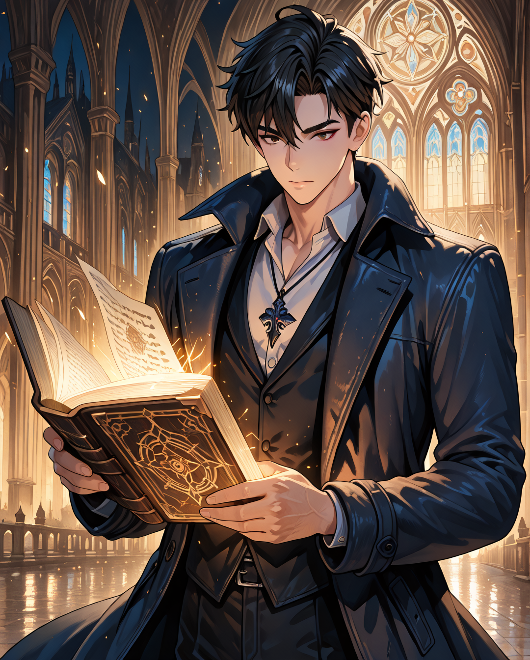 korean man channeling golden arcane energy, glowing grimoire, dramatic library lighting