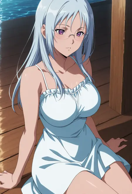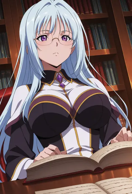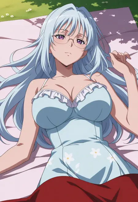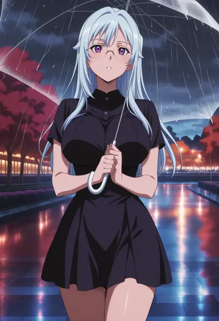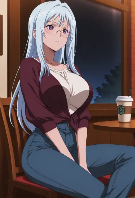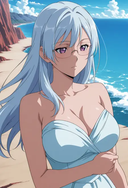 示例提示:sysdeep_AnimeChar_6, 1girl, solo, long hair, large breasts, purple eyes, rimless eyewear, light blue hair