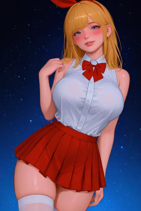 white shirt, red skirt, hair bow, bowtie, pleated skirt, sleeveless shirt, zettai ryouiki, red bow, white thighhighs, sandals,