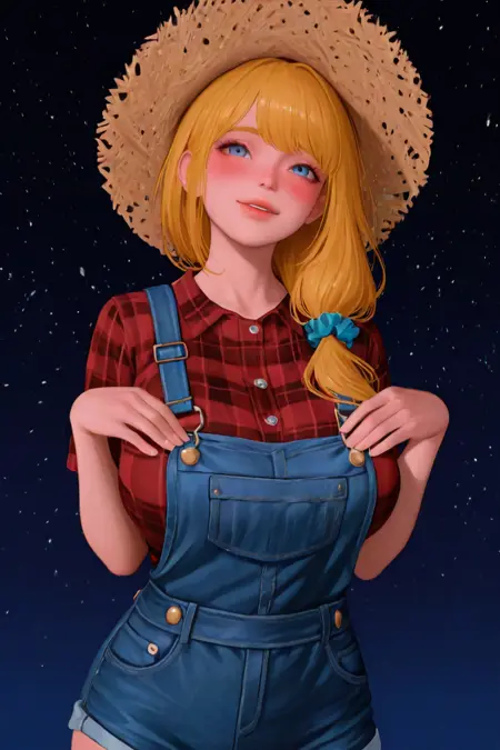 red shirt, plaid shirt, short sleeves, blue overalls, denim, scrunchie, straw hat, boots,