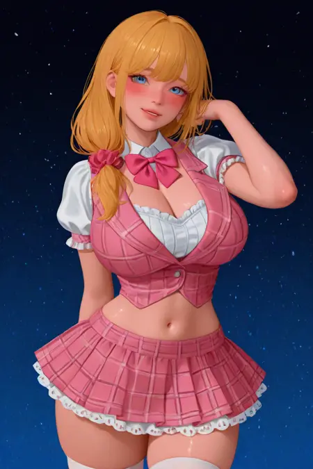 navel, midriff, cleavage, scrunchie, crop top, clothing cutout, short sleeves, puffy short sleeves, pink vest, miniskirt, pleated skirt, pink skirt, zettai ryouiki, hair bow, pink bow, plaid, frills, white thighhighs, pink footwear,