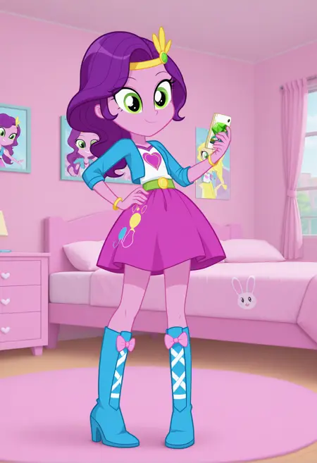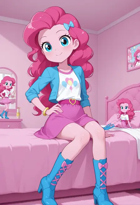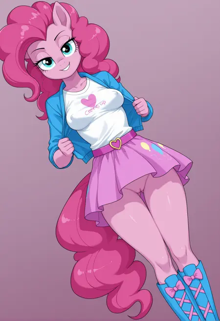 blue boots with laces and bows on the heels, a white T-shirt with a heart in the middle of the T-shirt, a blue short jacket, a belt creased with a batik, a pink skirt