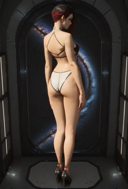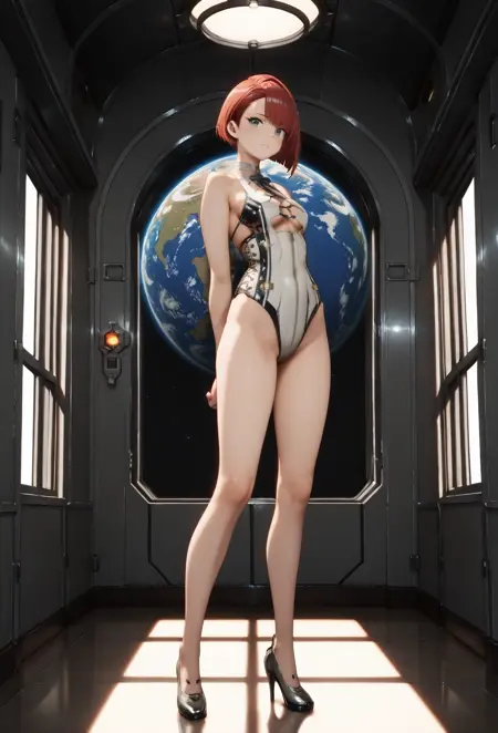 このLoRAは、Stellar Blade に登場するイヴの印象的な「MidSummerAlice」衣装を再現し、未来志向の美学と官能的な優雅さを融合させています。デザインには、高めのカットでツヤのあるボディスーツにウロコ状のテクスチャーが施され、前面のカットアウト部分は黒いリボンで結ばれ、両サイドには発光するテクノロジー要素が埋め込まれています。ヒール部分にも点灯する機械的な部品が組み込まれており、サイバーパンクな雰囲気を一層高めています。