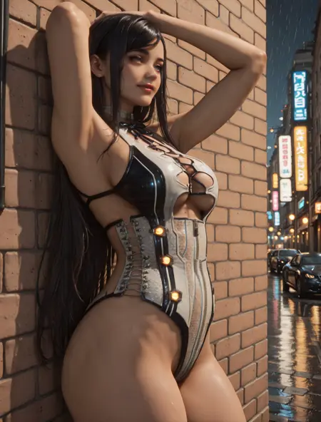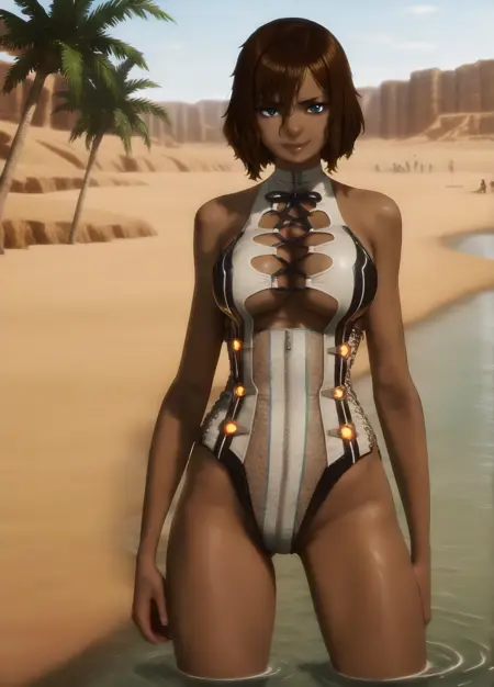 This LoRA captures Eve’s striking "MidSummerAlice" outfit from Stellar Blade, blending futuristic aesthetics with sensual elegance. The design features a high-cut, glossy bodysuit with scale-like texture, front cut-outs tied with black ribbon, and glowing tech elements embedded along the sides. The heels also feature illuminated mechanical parts, adding to the sci-fi vibe.