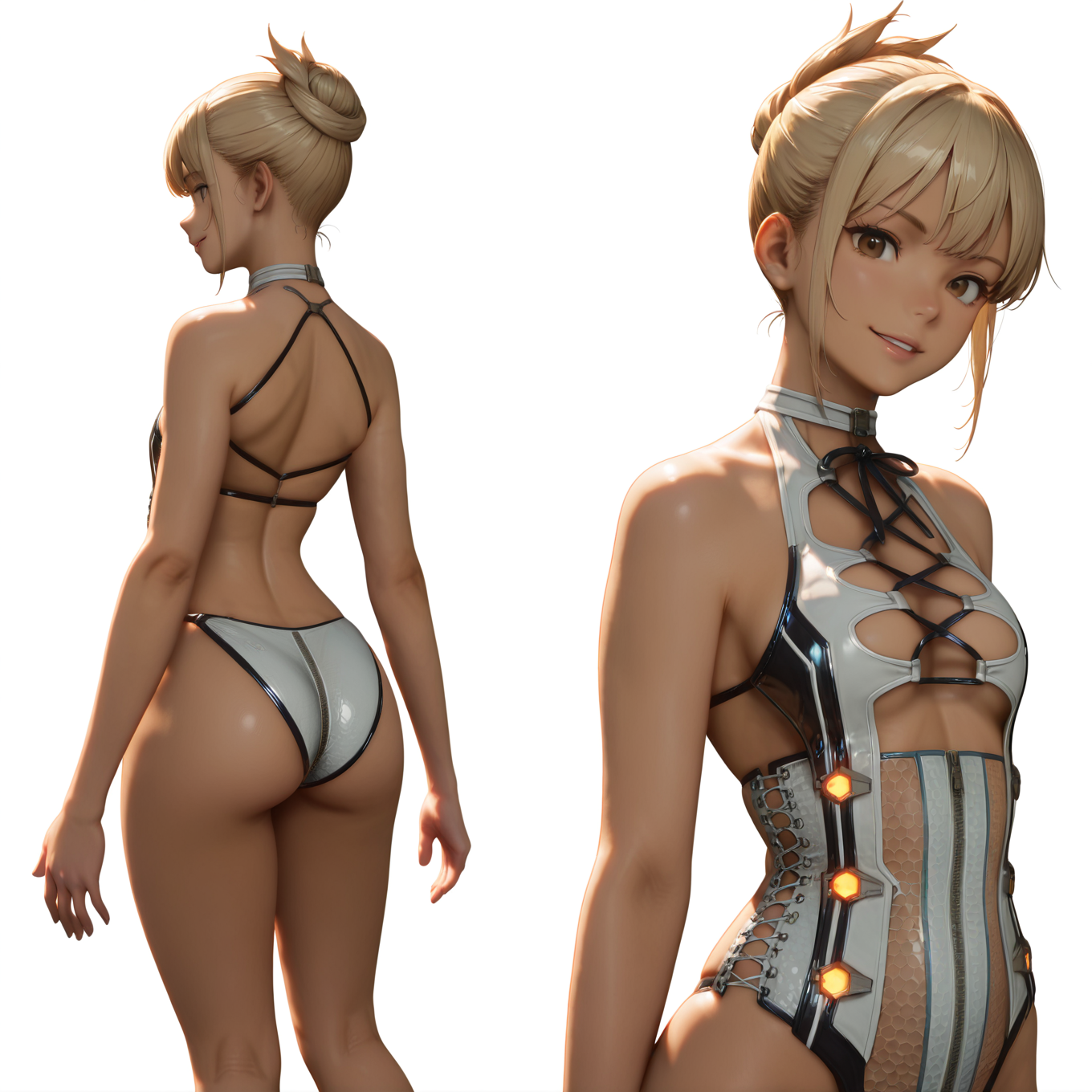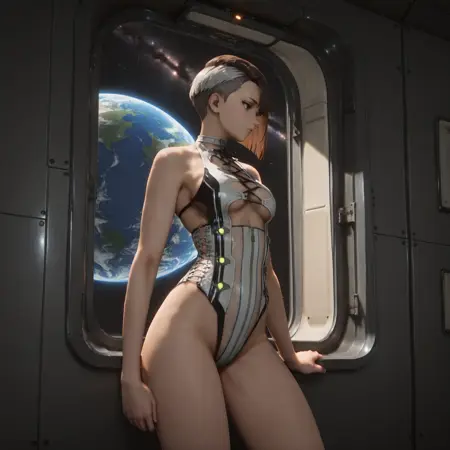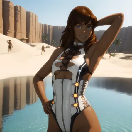 这个LoRA捕捉了《Stellar Blade》中Eve标志性的“MidSummerAlice”装扮,将未来主义美学与性感优雅融为一体。设计包含高开衩、光泽感的鳞片纹理连体衣,胸前切口用黑色丝带系结,两侧嵌入发光科技元素。高跟鞋也同样配有发光机械部件,强化了科幻氛围。