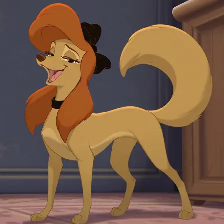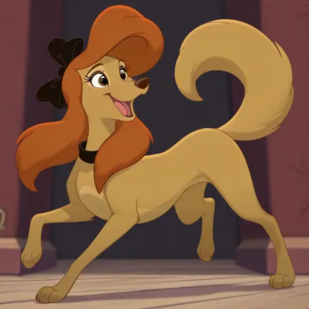 dixie, female, dog, disney, saluki, golden fur, beige belly, orange hair, black hair bow, black collar, brown eyes