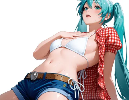 의상: 체크 셔츠, 빨간 셔츠, 벌어진 셔츠, 파란 반바지, 짧은 반바지, 벌어진 옷, 배꼽, 흰 비키니, 벨트, 옷 아래 비키니