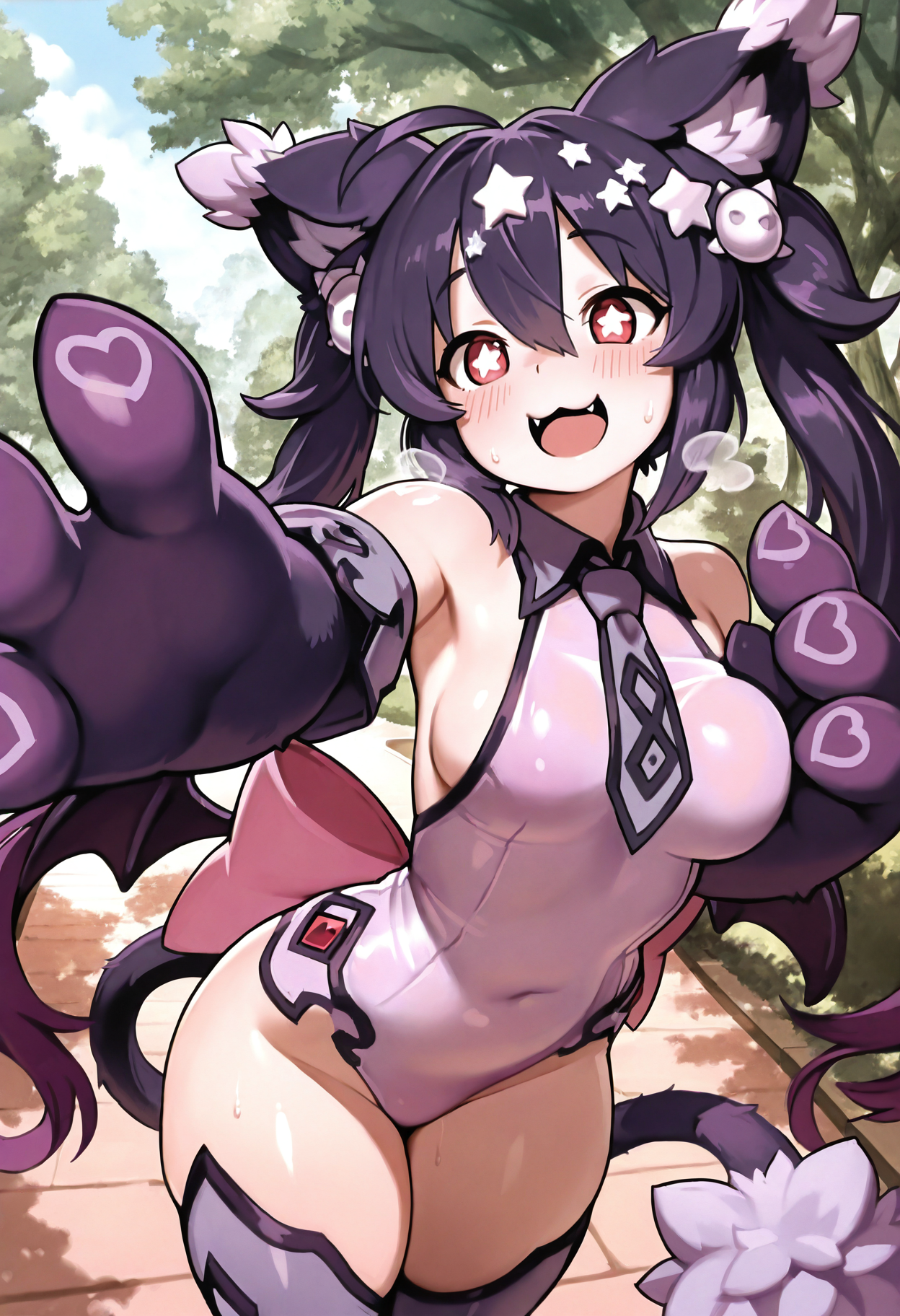 familiarmge, 怪物女孩, 动物手, 动物四肢, 手指较少, 超大手掌, 猫耳, 动物耳朵绒毛, 蝙蝠翅膀, 低垂翅膀, 深紫色翅膀, 毛尖尾巴, 紫色尾巴, 白色毛尖, 星形瞳孔, 符号形瞳孔, 心形瞳孔, 明亮瞳孔, 紫色手套, 渐变手套