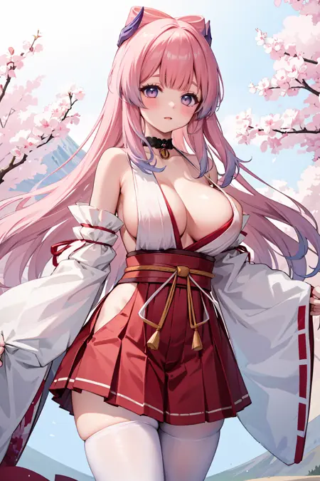 上半身のトリガーワード: shrine maiden, japanese clothes, detached sleeves, cleavage