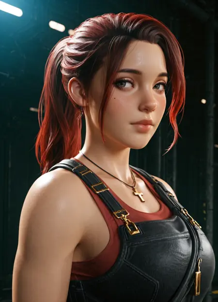 necklace, solo, jewelry, black overalls, red hair, tank top, cross, mole, multicolored hair, brown eyes,