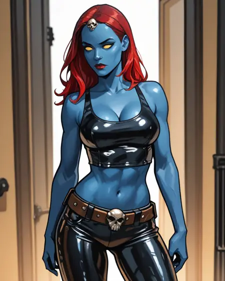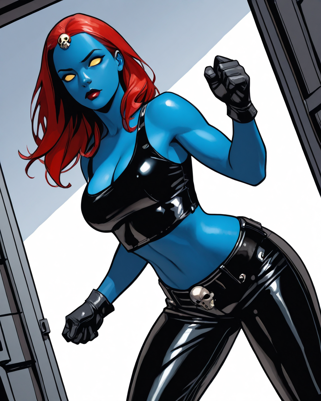 Solo book: mystiqueraven, 1girl, colored skin, blue skin, red hair, skull hair ornament, yellow eyes, no pupils, crop top, tank top, midriff, leather pants, belt, cleavage, gloves