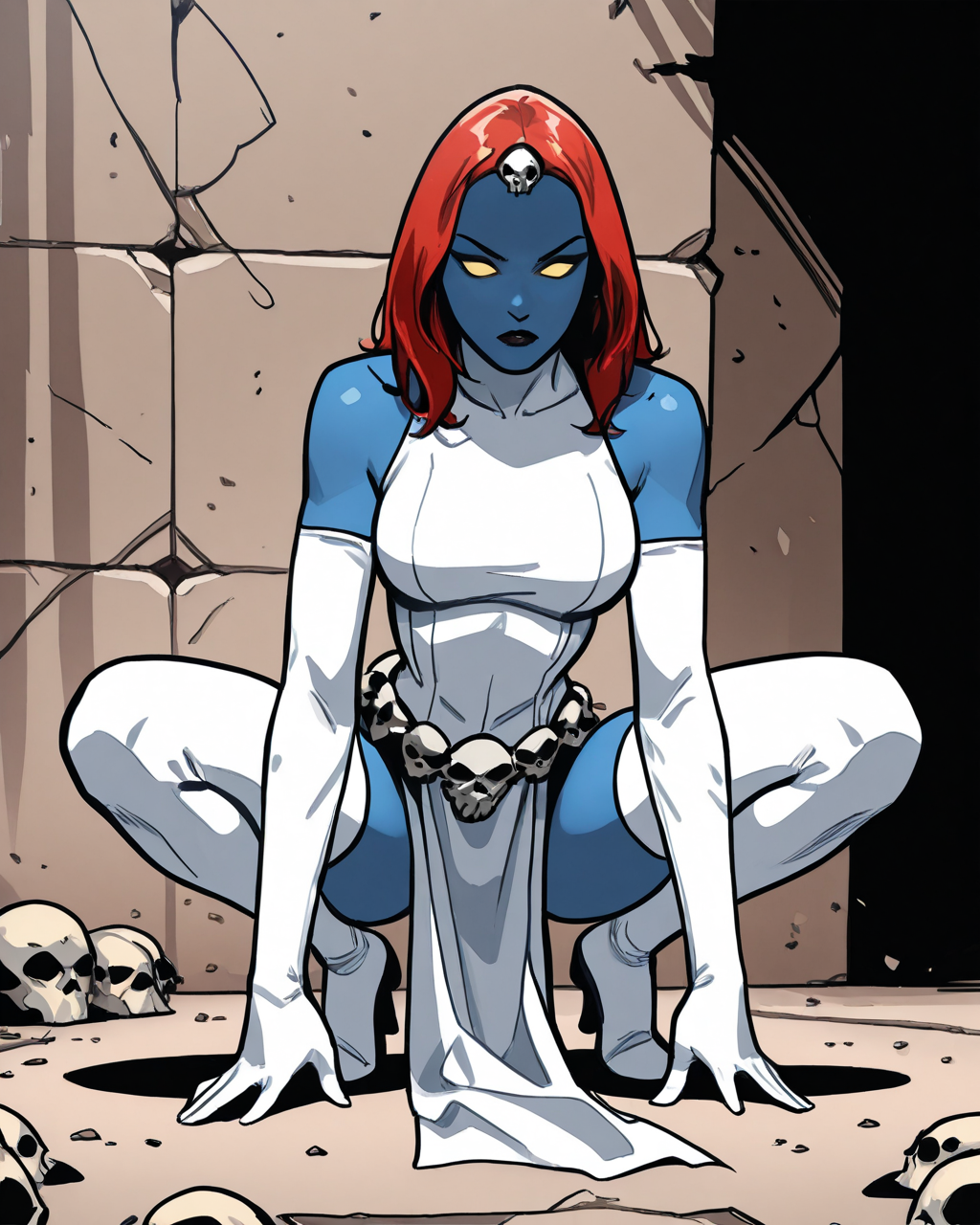 Classic: mystiqueraven, 1girl, colored skin, blue skin, red hair, skull hair ornament, yellow eyes, no pupils, elbow gloves, thighhighs, dress, pelvic curtain, skull belt