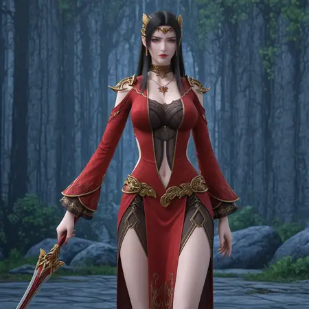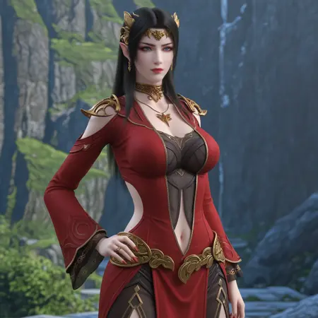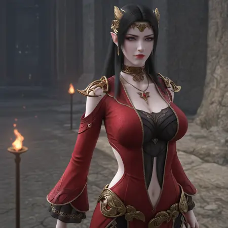 トリガー語:meidusha, 1girl, solo, 黒髪, 青い目, 胸, 中心開口部, 胸元, 衣服の切り替え, 肩の切り替え, ドレス, 赤いドレス, ピアス, 髪飾り, ジュエリー, 長髪, 長袖, おへそ, ネックレス, 尖った耳, 指輪,