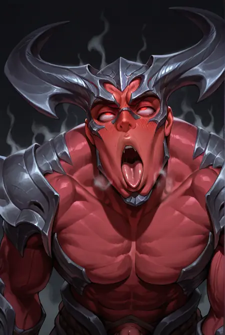 Odyss3y rhaast, demon, spikes, teeth, sharp teeth, no eyes, horns, helmet, armor, shoulder armor, pauldrons