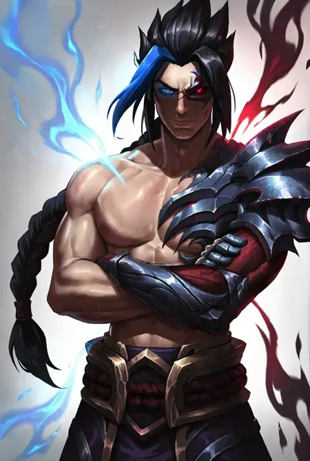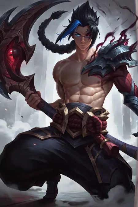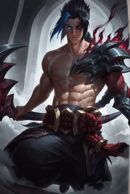 k4yn, kayn \(league of legends\), black hair, heterochromia, red eyes, shoulder armor, topless male, armor, muscular, multicolored hair, long hair, pectorals, abs, ponytail, glowing eyes, black sclera, blue hair, colored sclera, braid