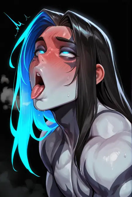0dyssey kayn,jewelry, earrings, blue hair, two-tone hair, multicolored hair, eyepatch, one eye covered, bangs, yellow eyes, black sclera, facial hair, bracelet, gloves, bodysuit, shoulder armor, belt