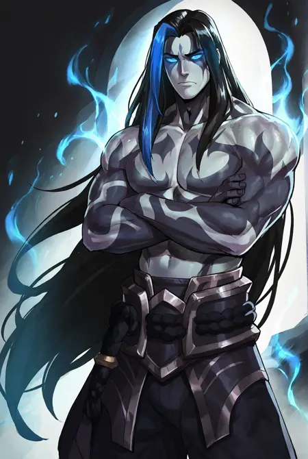 assassin kayn, long hair, black hair, topless male, colored skin, multicolored hair, glowing eyes, muscular, blue eyes, armor, blue hair, tattoo, pants