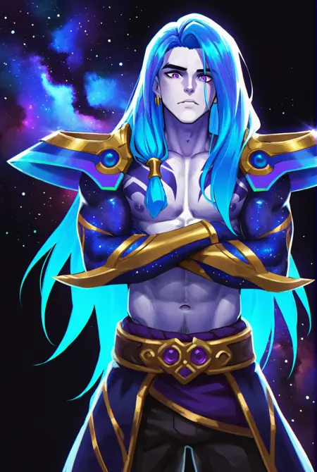 Odyss3y blue k, 长发, 刘海, 蓝发, 亮泽头发, 彩色皮肤, 紫眼, 护甲, 肩甲, 纹身, 无上衣男性, 黑色裤子, 靴子, 黑色鞋履