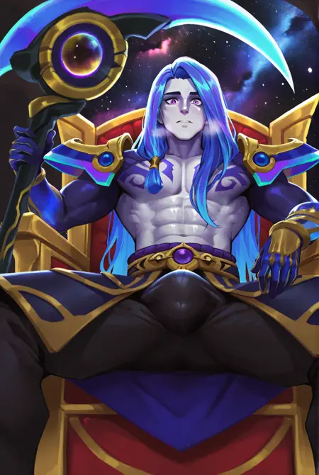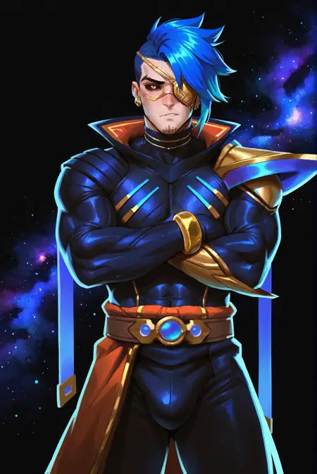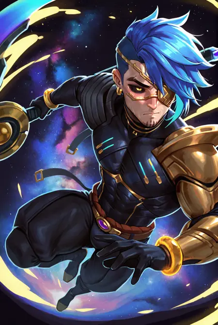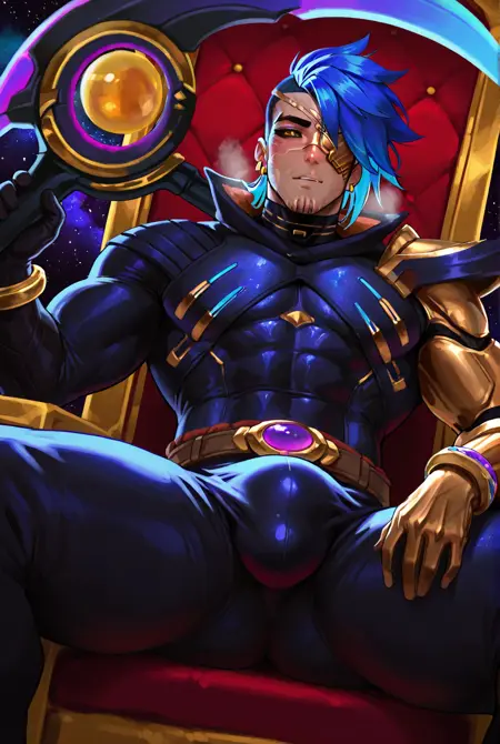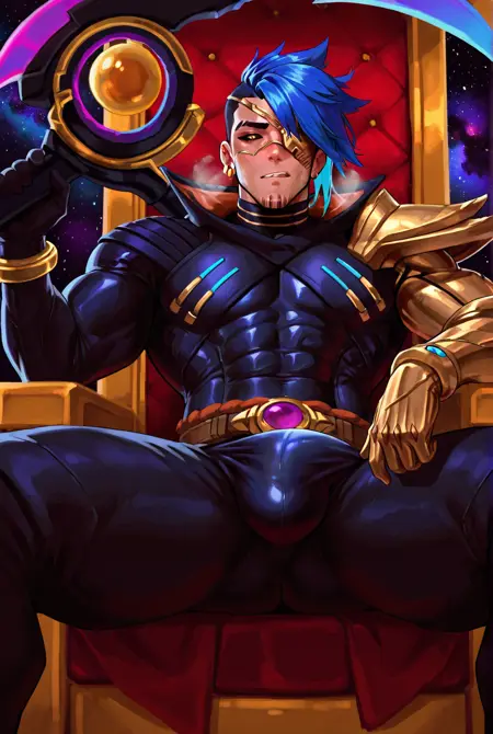 0dyssey kayn, 珠宝, 耳环, 蓝发, 双色头发, 多色头发, 眼罩, 一只眼被遮住, 刘海, 黄眼, 黑色眼白, 面部毛发, 手镯, 手套, 连体衣, 肩甲, 腰带