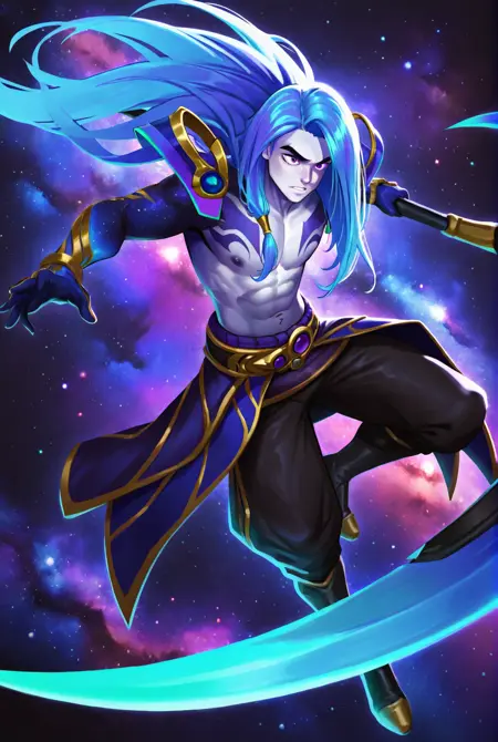 assassin kayn, 长发, 黑发, 无上衣男性, 彩色皮肤, 多色头发, 发光眼睛, 肌肉发达, 蓝眼, 护甲, 蓝发, 纹身, 裤子