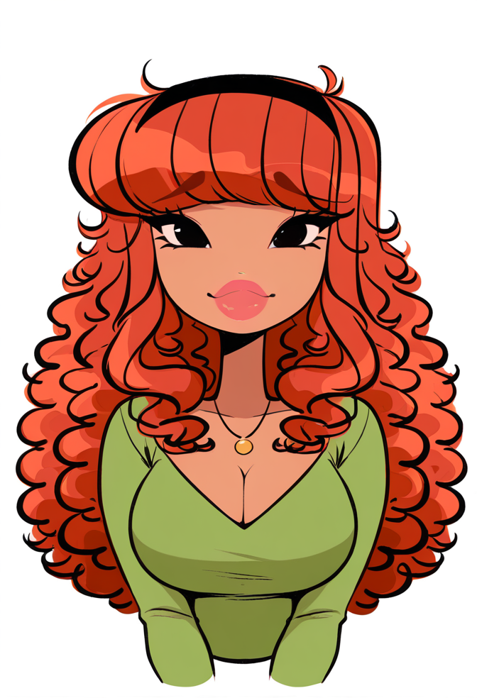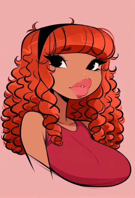dendrain, long hairred hair, hairband, dark skin, orange hair, black eyes, dark-skinned female, lips, makeup, black hairband, chest, lipstick, curly hair, thick lips