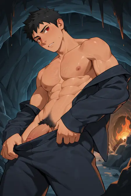 Suggested Character Tags: 1boy, solo, male focus, red eyes, black hair, spiked hair, jacket, blue pants, goggles, forehead protector
