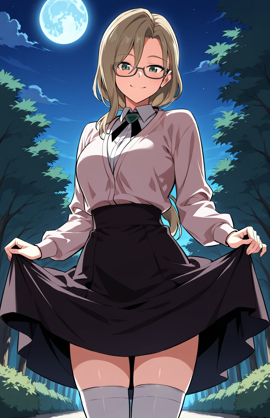 Isabelle, 1girl, solo, long hair, blonde hair, low ponytail, loose strands, side-swept bangs, green eyes, glasses,