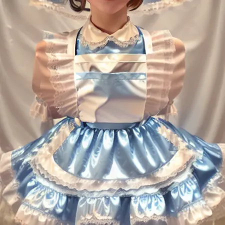 light blue and white shiny satin puffy pinafore dress, white lace-trimmed peter pan collar, light blue lace-trimmed puffy short sleeves, white frilled lace-trimmed pinafore straps, white lace, white lace trim, (white lace-trimmed apron)