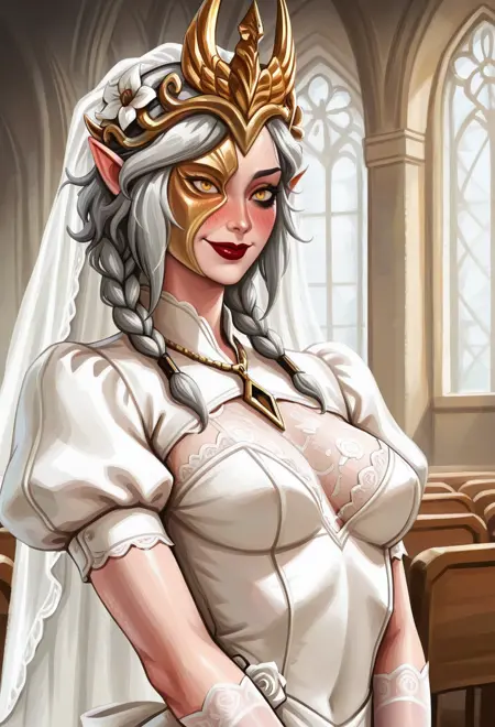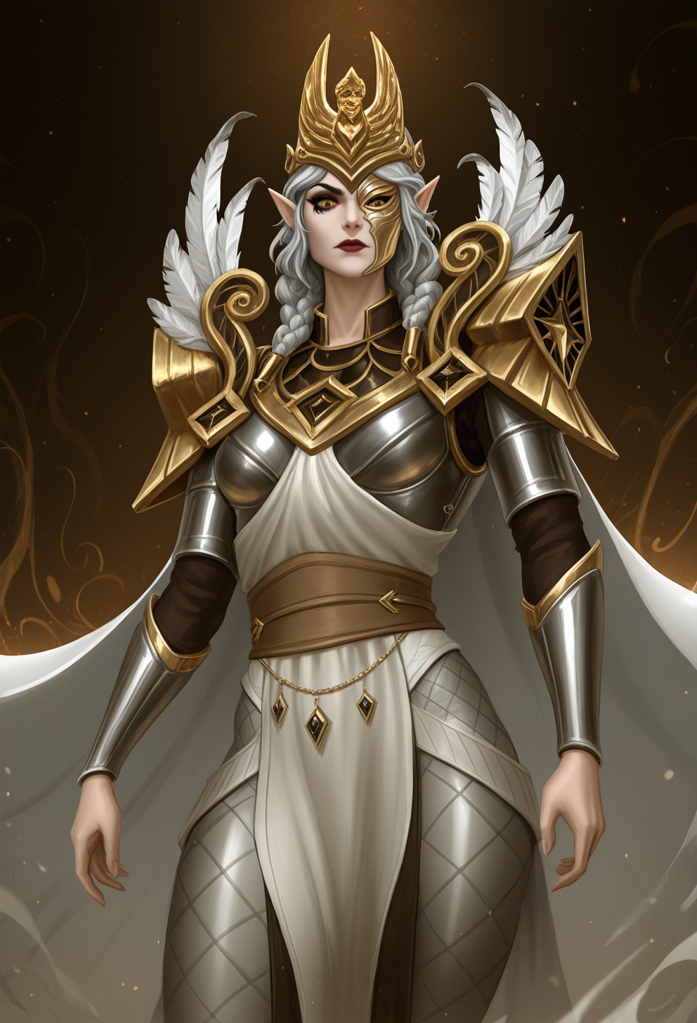 외모 - ssmldy, 회색 머리, 두 줄 땋은 머리, 노란 눈, 검은 메이크업, 뾰족한 귀, 금색 머리장식, 금색 마스크, 반쪽 얼굴 가림