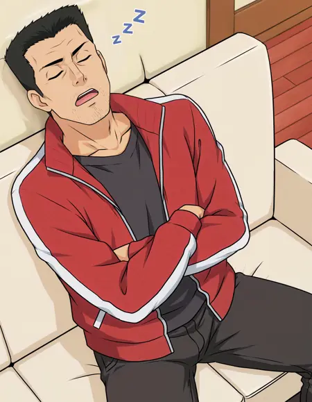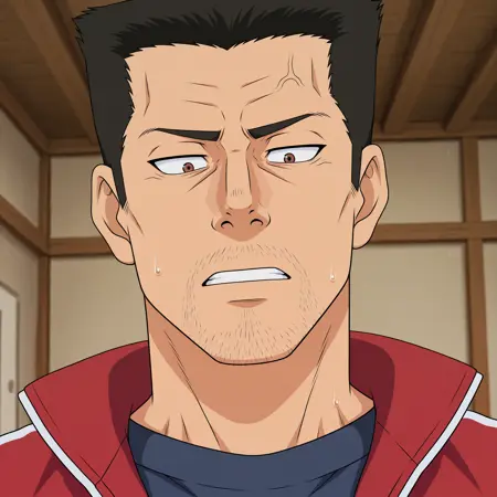 上記の点2から派生して、キャラクターの顔のディテールを強化するために、mature male, stubble, sanpaku(オプション), brown eyes などのプロンプトを追加してください。
