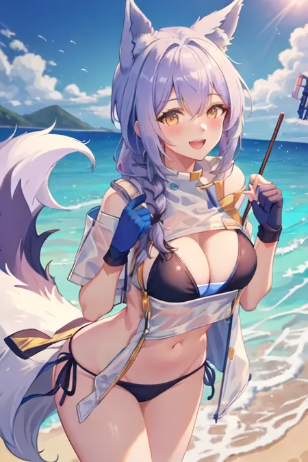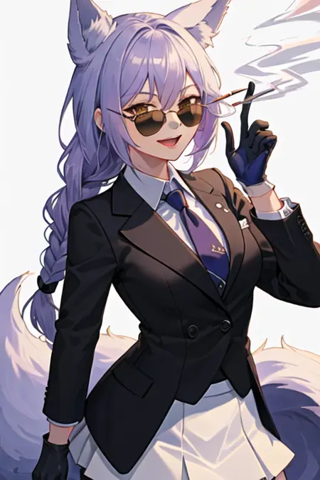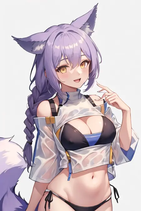- The pruned character tags are animal ears, wolf ears, tail, long hair, purple hair, wolf tail, yellow eyes, braid, hair between eyes, wolf girl, breasts, large tail, single braid, medium breasts. You can add them into prompts when core features (e.g. hair color) of character is not so stable.