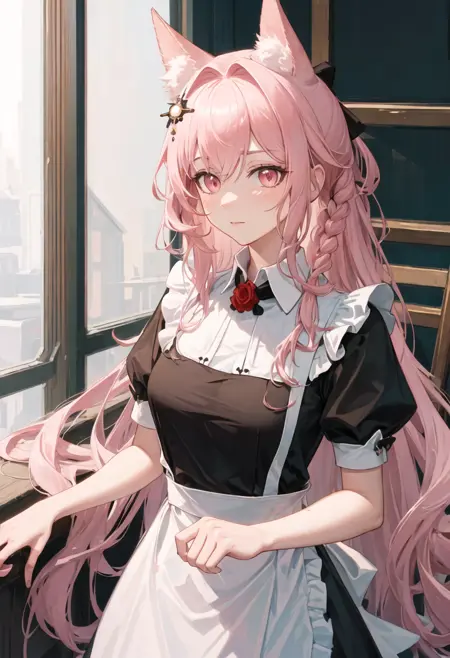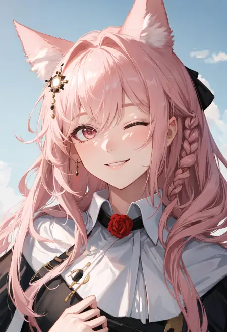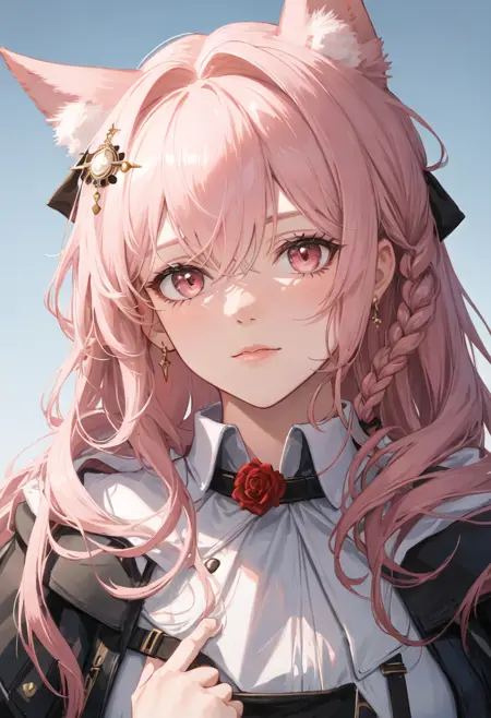 - 省略されたキャラクタータグは、動物の耳、ピンクの髪、長い髪、オオカミの耳、オオカミガール、胸、ピンクの目、非常に長い髪、動物の耳のふわふわ、髪飾り、編み込み、髪の流れ、大きな胸、追加の耳、中程度の胸、赤い目です。キャラクターの主要な特徴(例:髪の色)が安定していない場合、これらのタグをプロンプトに追加してください。