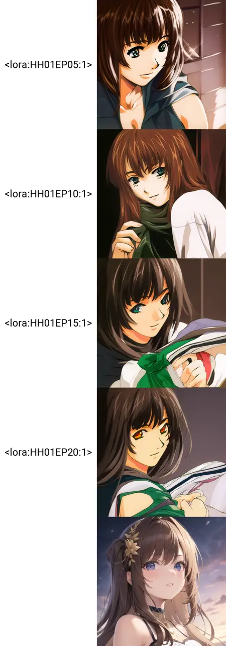 以下是部分训练过程图,我的 LoRA 名称为 HH02EP20,其中“HH”是该大师名字的缩写,“02”表示第二个模型,“EP20”表示训练轮数为 20。若需要更多训练轮数,请在下方留言。