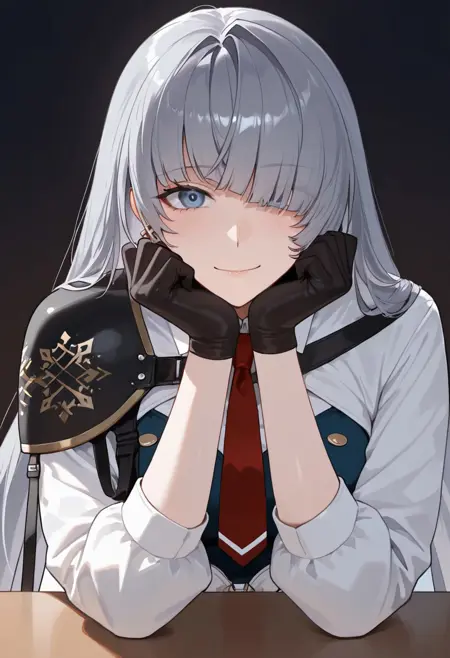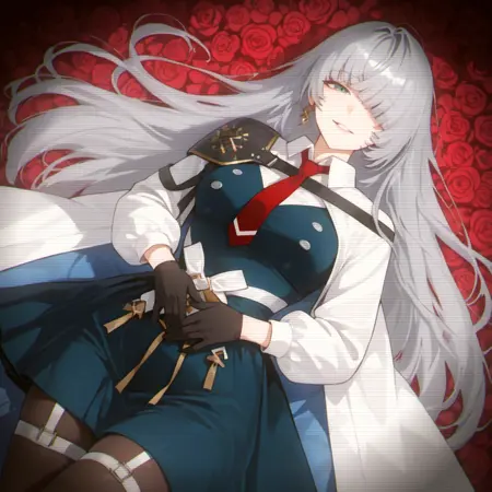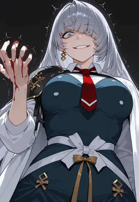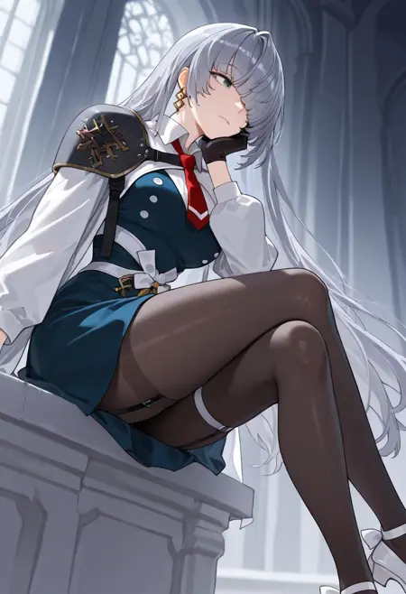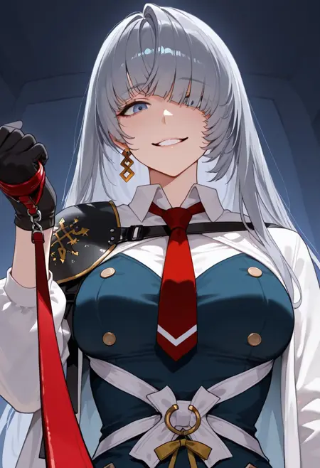 グレーヘア、ロングヘア、前髪、斜め前髪、片目にかかった髪、ピアス、ゴールドピアス、青い瞳、グレーの虹彩、白いインナーシャツ、カラー付きシャツ、ネクタイ、赤いネクタイ、中程度の胸、濃い青のワンピース、短いスカート、ゴールドのジュエリー、ドレス下部の装飾、ボタン、黄色いリボン、白い装飾、中央の装飾、白いコート、ロングスリーブ、白いスリーブ、ルーズスリーブ、黒い手袋、パンティストッキング、太ももストラップ、ガーター straps、白いフラットシューズ、片肩パッド、
