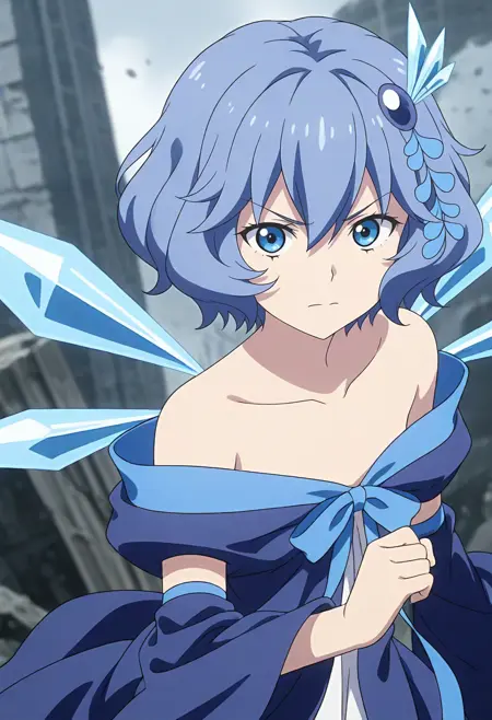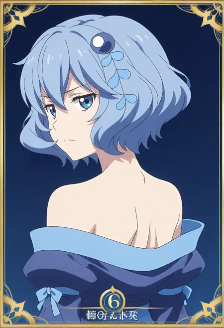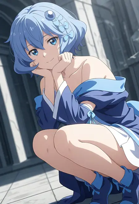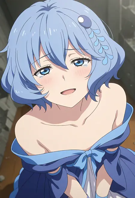 헤어스타일 등(필요 시): blue eyes, blue hair, short hair, hair ornament
