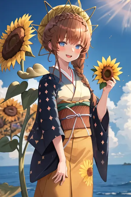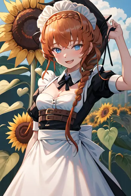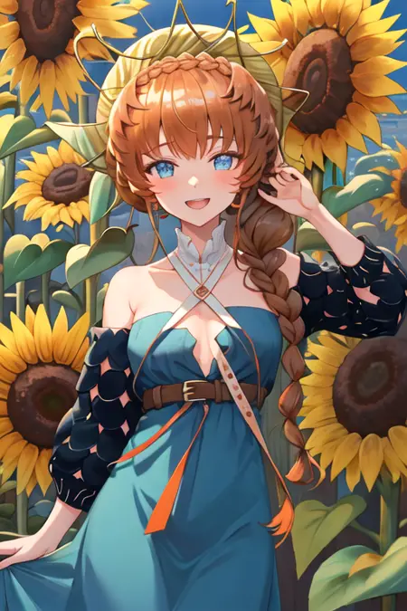 触发词为 van_gogh_fgo,推荐标签为:best quality, masterpiece, highres, solo, {van_gogh_fgo:1.15}, braid, long_hair, blue_eyes, bangs, side_braid, hat, orange_hair, crown_braid, smile, brown_hair, flower, sunflower, open_mouth。