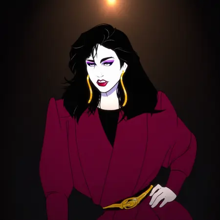 PizzazMillerMC, 1个女孩, 单人, 白皙皮肤, 黑色头发, 长发, 刘海, 凌乱的头发, 耳环, 紫色眼睛, 眼影, 化妆, 饱满嘴唇, 红色口红, 梅子紫色连衣裙, 大乳房, 腰带, 厚大腿, 长袖, 鞋子,