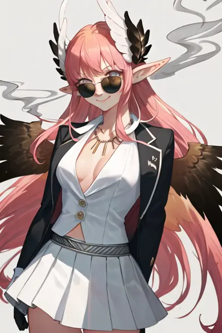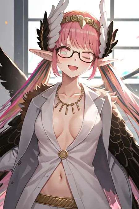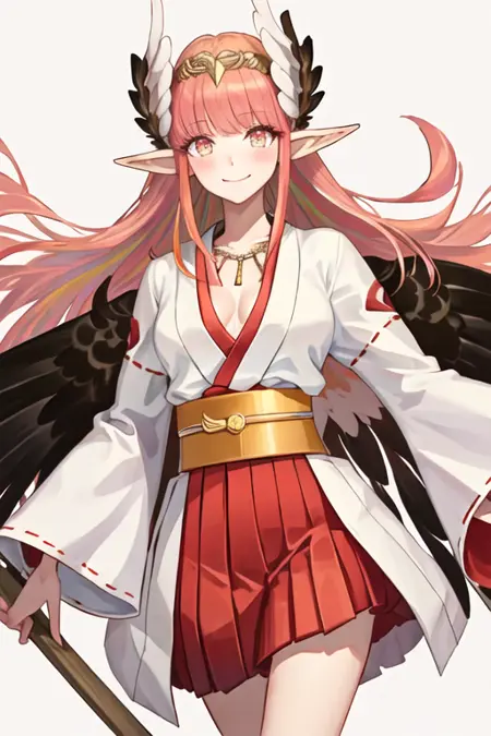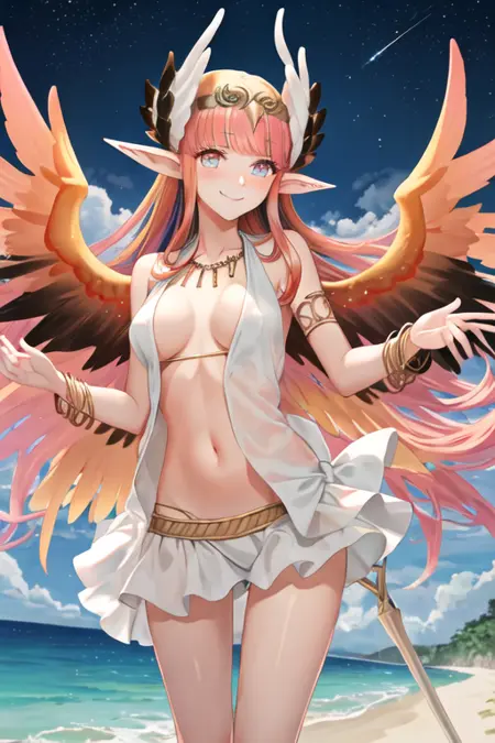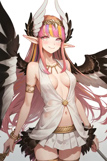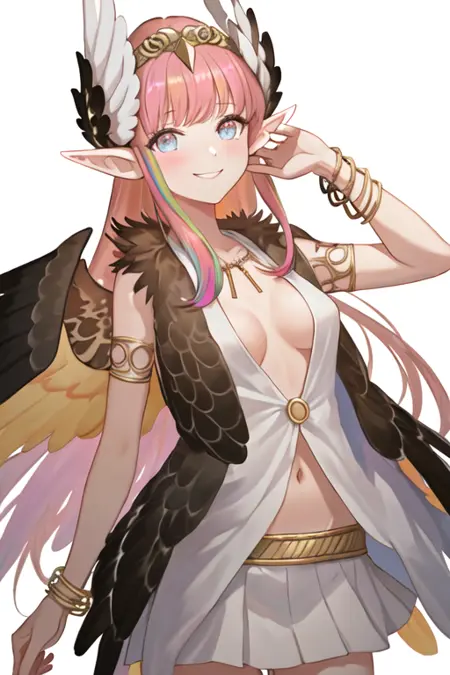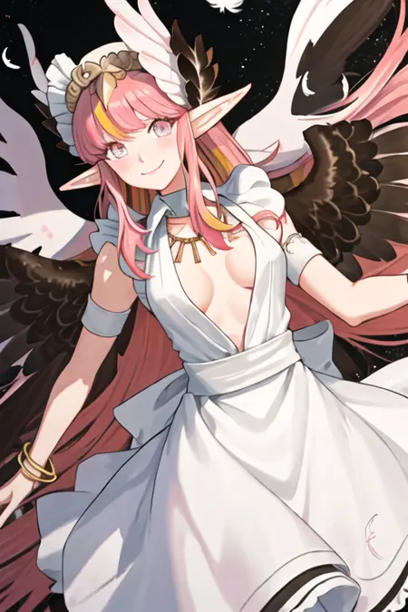 触发词为circe_fgo,推荐标签为:best quality, masterpiece, highres, solo, {circe_fgo:1.15}, pointy_ears, pink_hair, head_wings, wings, bangs, feathered_wings, long_hair, jewelry, smile, breasts, necklace, blush, small_breasts, multicolored_eyes。