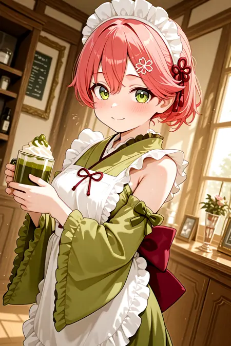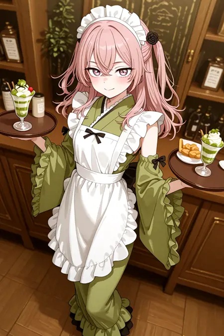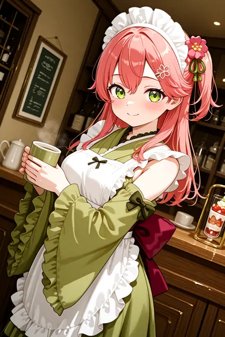 MatchaCore_Miku_Matcha_Green_Tea_Parfait_Dress, frills, japanese clothes, green kimono, frilled kimono, green dress, wide sleeves, green sleeves, wa maid, maid headdress, hair ornament, maid apron, white apron, frilled apron, ((detached sleeves)), frilled sleeves, ribbon, bow, back bow, hair flower