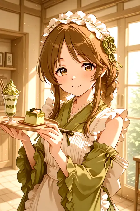 ある蒸し暑い夏の日、高森藍子ちゃんは、抹茶色のグリーンティーパフェドレスを着て、ファンのため涼しいパフェを作った。