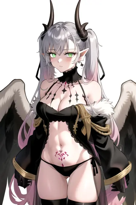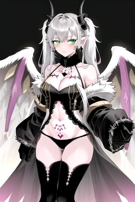 | 학습된 단어 | LilithAscen3, absurdly long hair, 1girl, solo, long hair, medium breasts, wings, black panties, monster girl, green eyes, pointy ears, dark-skinned female, cleavage, earrings, jewelry, grey hair, gradient hair, black dress, navel, black horns, [pink hair], see-through dress, feathered wings, bare shoulders, colored tips, long sleeves, neck fur, thighhighs, demon horns, fur trim, wide sleeves, con, twintails, stomach tattoo, puffy long sleeves,복사됨! |